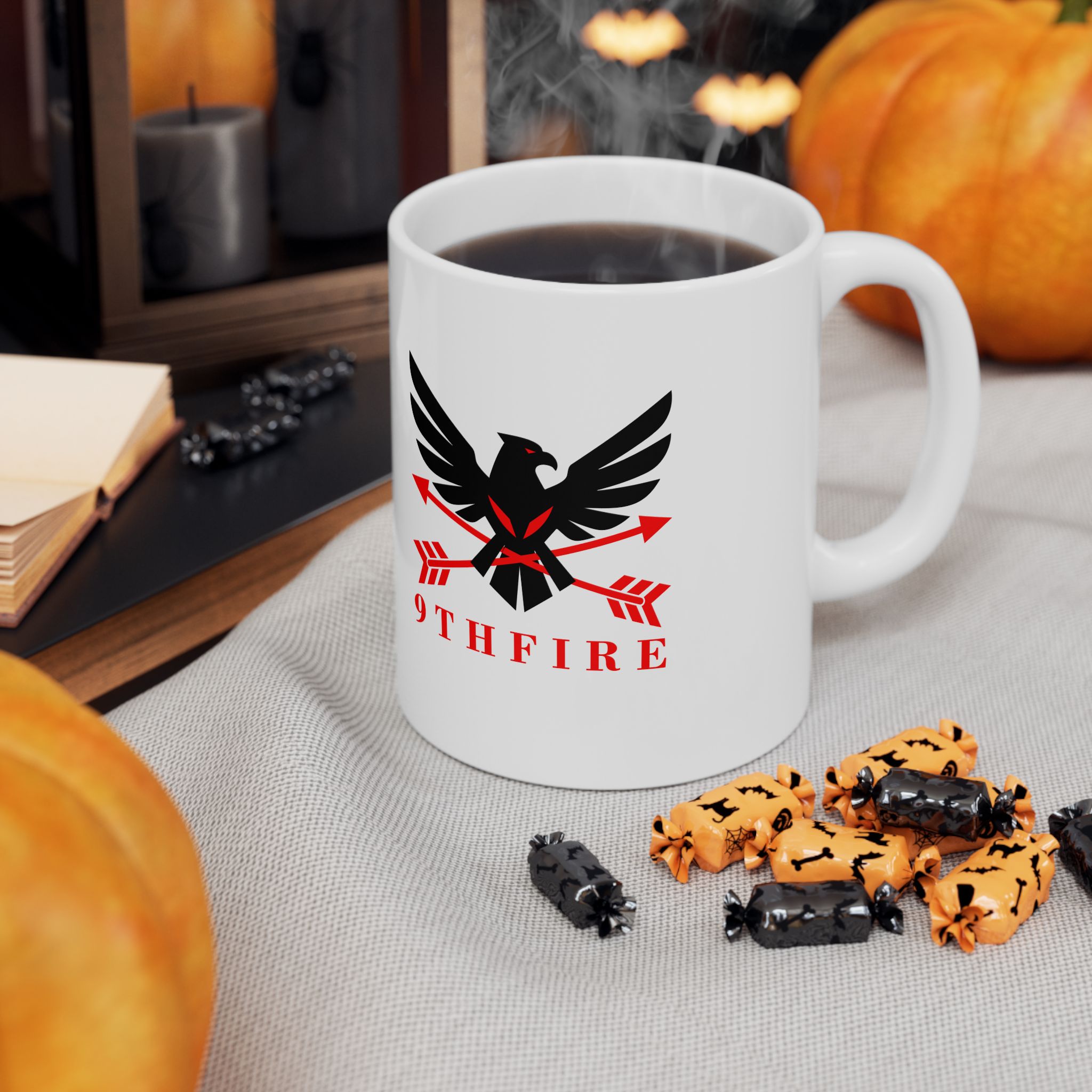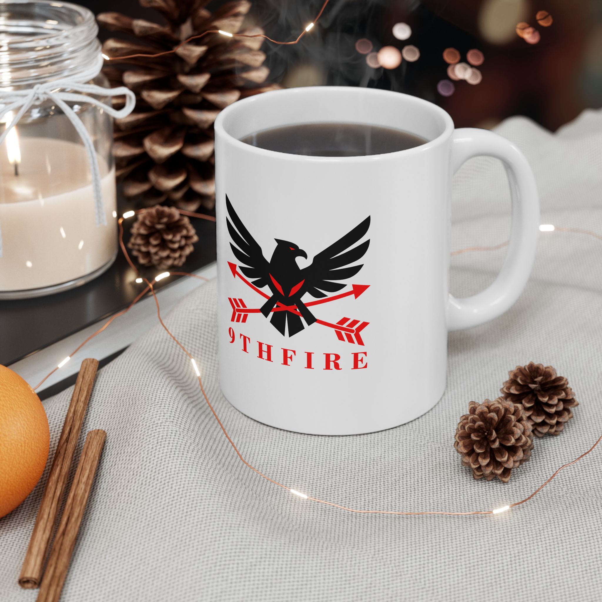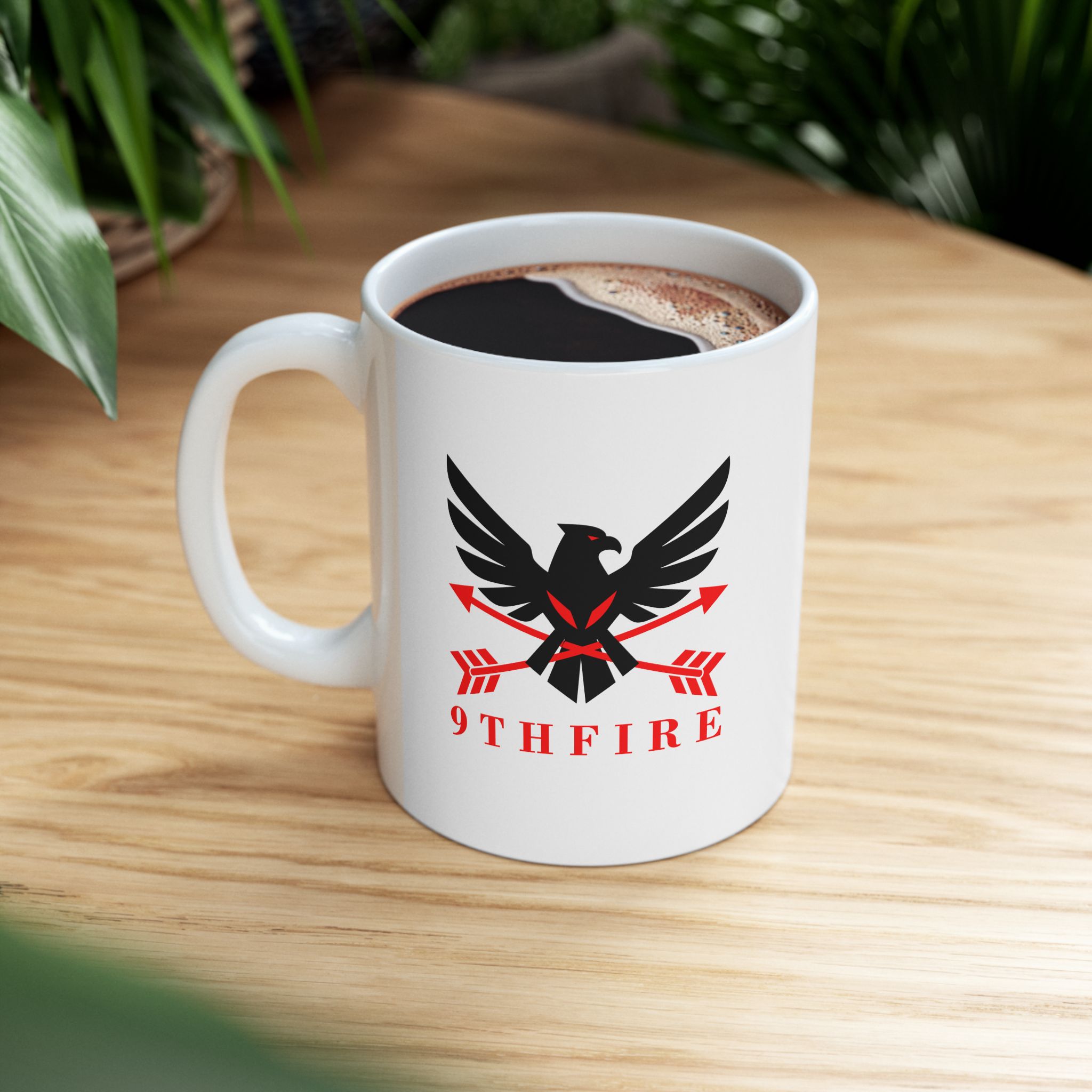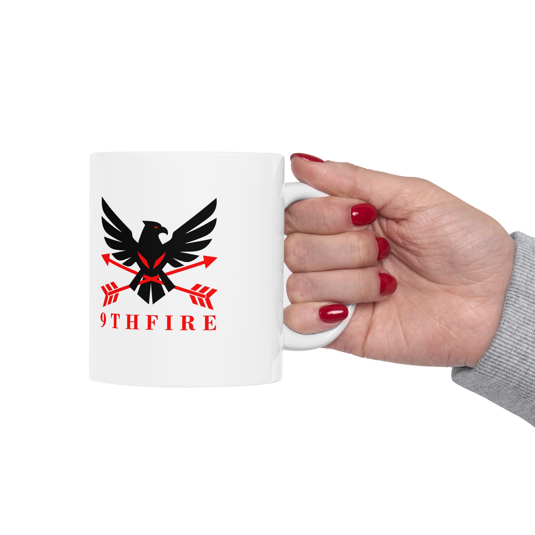 This glossy ceramic mug brings bold, graphic energy to everyday coffee and tea rituals. The white base makes the crisp black-and-red emblem pop, lending a confident, slightly vintage-military feel that suits someone who values purpose and personality in their kitchenware. It feels steady in the hand thanks to a comfortable C-handle and has a shiny finish that catches the light. Use it at your desk for a focused morning, beside a notebook while planning, or stacked into a rotating lineup with other emblematic pieces — it anchors a routine without shouting for attention.