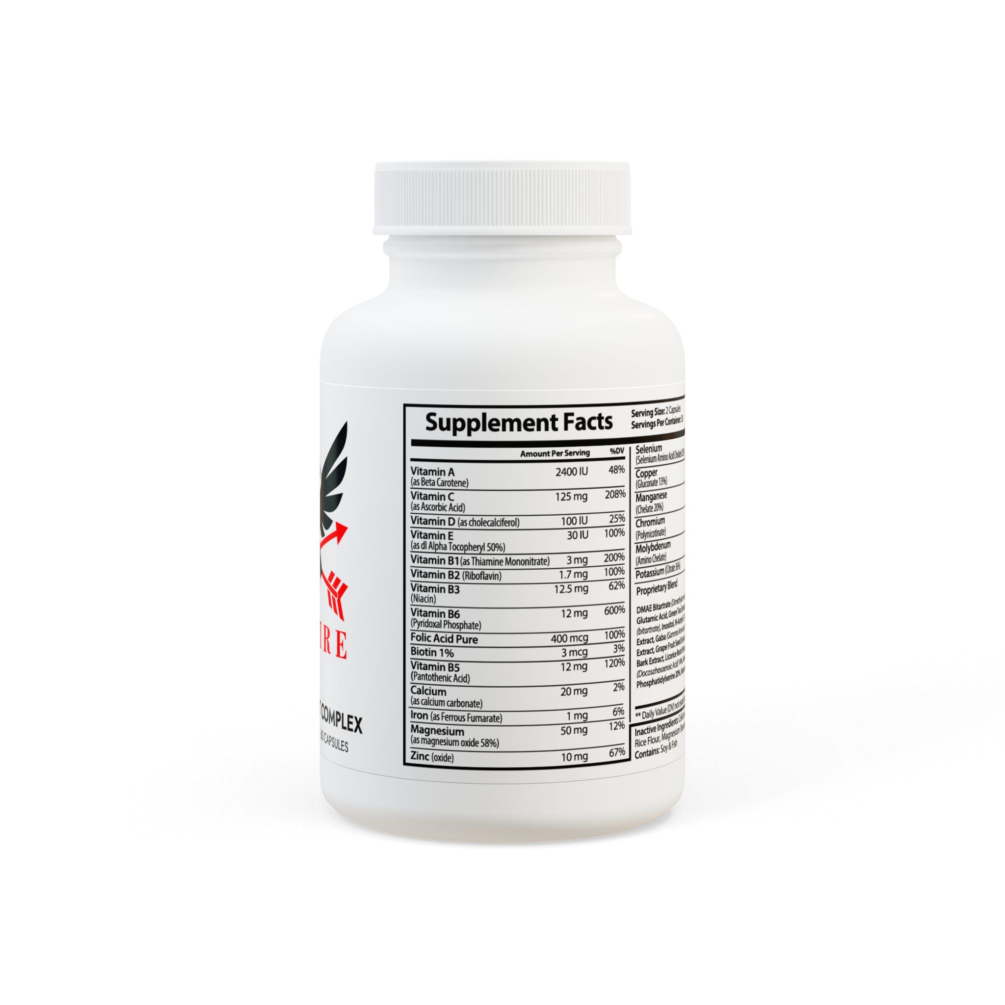 - Ingredients: Vitamin A (as Beta Carotene), Vitamin C (as Ascorbic Acid), Vitamin D (as cholecalciferol), Vitamin E (as dl Alpha Tocopheryl 50%), Vitamin B1(as Thiamine Mononitrate), Vitamin B2 (Riboavin), Vitamin B3 (Niacin), Vitamin B6 (Pyridoxal Phosphate), Folic Acid Pure, Biotin, Vitamin B5 (Pantothenic Acid), Calcium (as calcium carbonate), Iron (as Ferrous Fumarate), Magnesium (as magnesium oxide 58%), Zinc (oxide), Selenium (Selenium Amino Acid Chelate 0.2%), Copper (Gluconate 13%), Manganese (Chelate 20%), Chromium (Polynicotinate), Molybdenum (Amino Chelate), Potassium (Citrate 36%), DMAE Bitartrate (Dimethylaminoethanol), L Glutamine, Glutamic Acid, Green Tea Extract, Bacopa Extract, Choline (bitartrate), Inositol, N-Acetyl L-Tyrosine, Bilberry Fruit Extract, Gaba (Gamma Aminobutyric Acid), Grape Seed Extract, Grape Fruit Seed Extract, Olive Leaf, Cinnamon Bark Extract, Licorice Root Extract, Boron (Citrate), DHA (Docosahexaenoic Acid) 14%, Vanadyl Sulfate 19%, Phosphatidylserine 20%, Huperzine A. Inactive Ingredients: Cellulose (Vegetable Capsule), Rice Flour, Magnesium Stearate, Silicon Dioxide. Contains: Soy & Fish