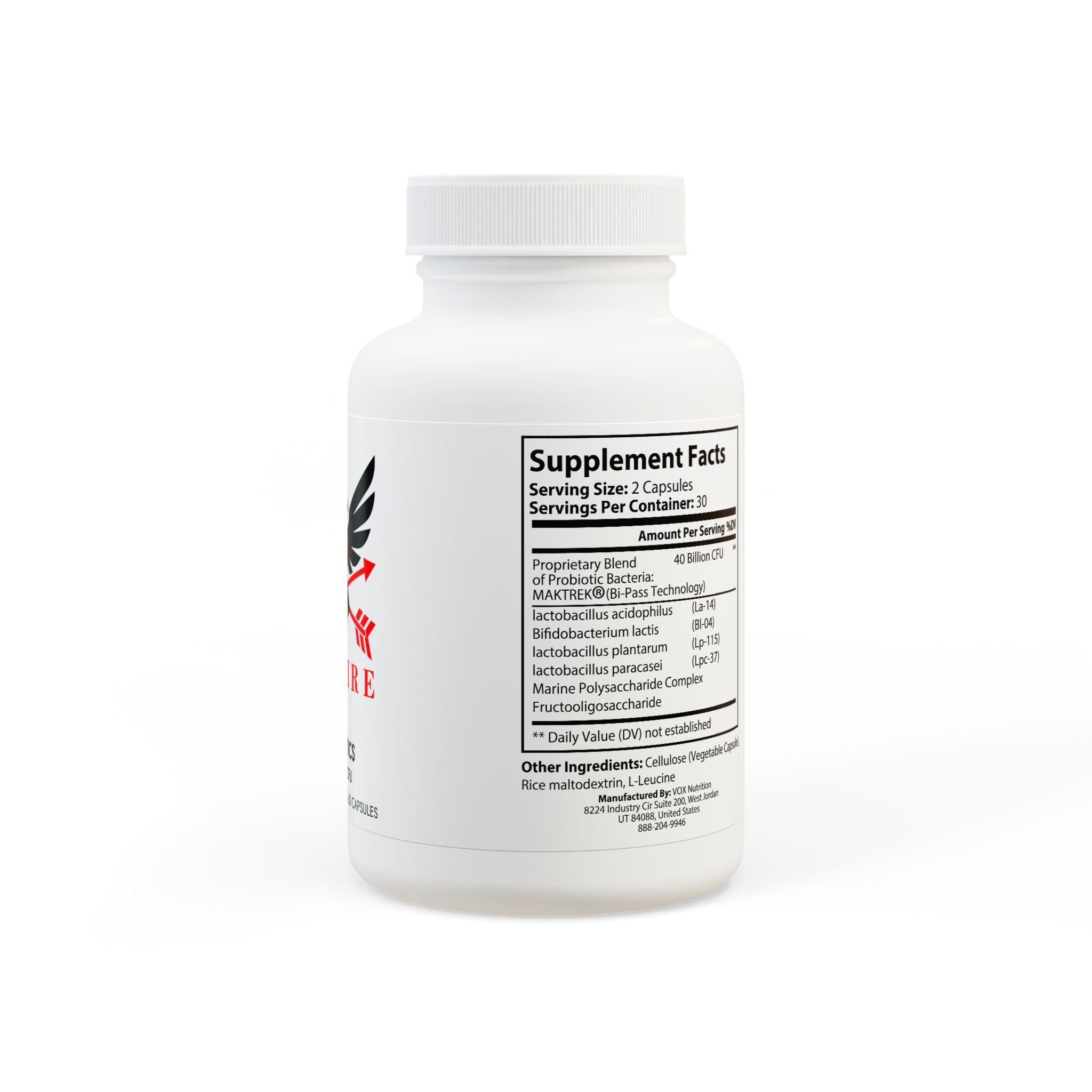 Key ingredients include a Proprietary Blend of Probiotic Bacteria with MAKTREK® (Bi-Pass Technology), Lactobacillus acidophilus, Bifidobacterium lactis, Lactobacillus plantarum, Lactobacillus paracasei, Marine Polysaccharide Complex, and Fructooligosaccharide® (FOS).