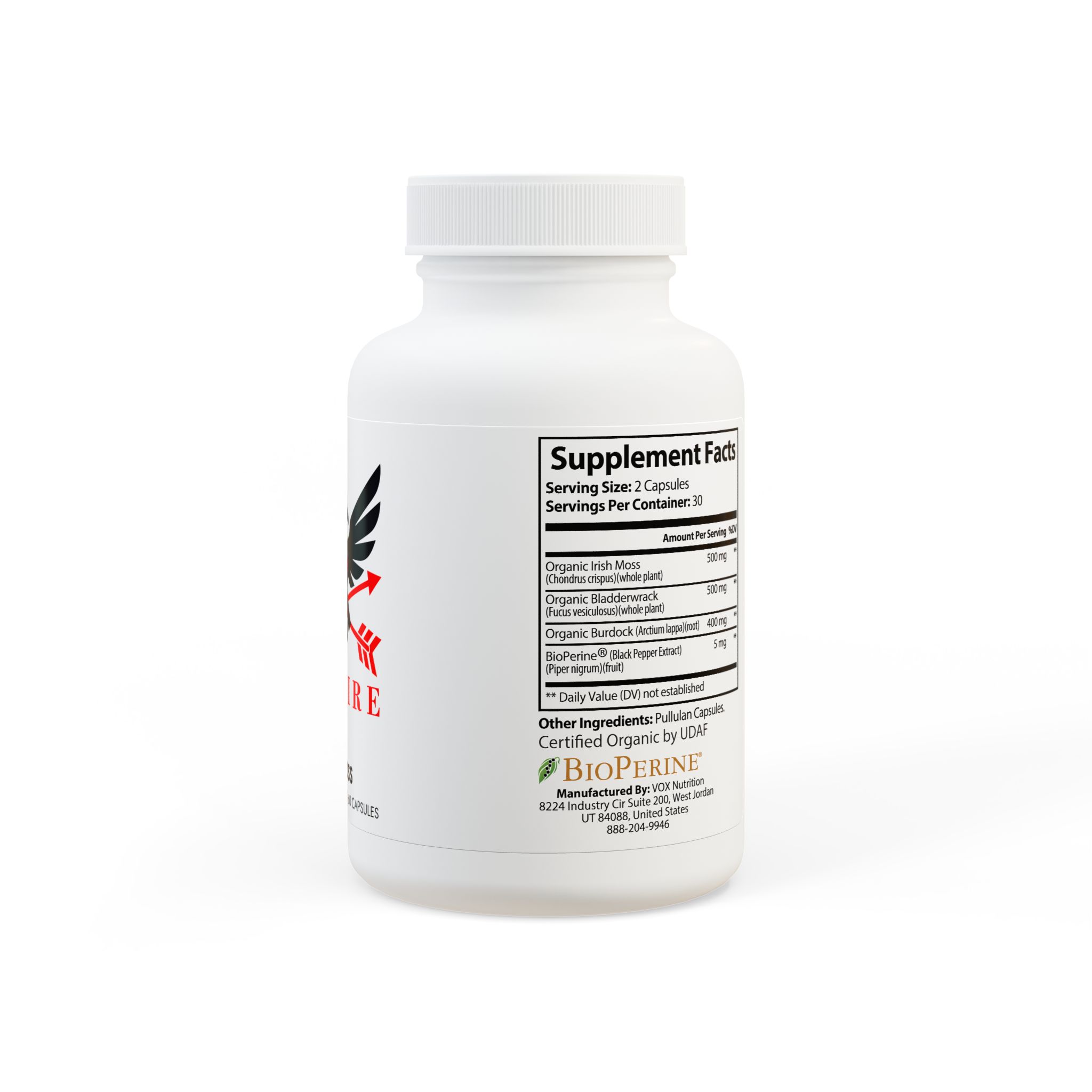 Ingredients: Organic Irish Moss (Chondrus crispus)(whole plant), Organic Burdock (Arctium lappa)(root), Organic Bladderwrack (Fucus vesiculosus)(whole plant), BioPerine® (Black Pepper Extract), (Piper nigrum)(fruit). Other Ingredients: Pullulan Capsules.